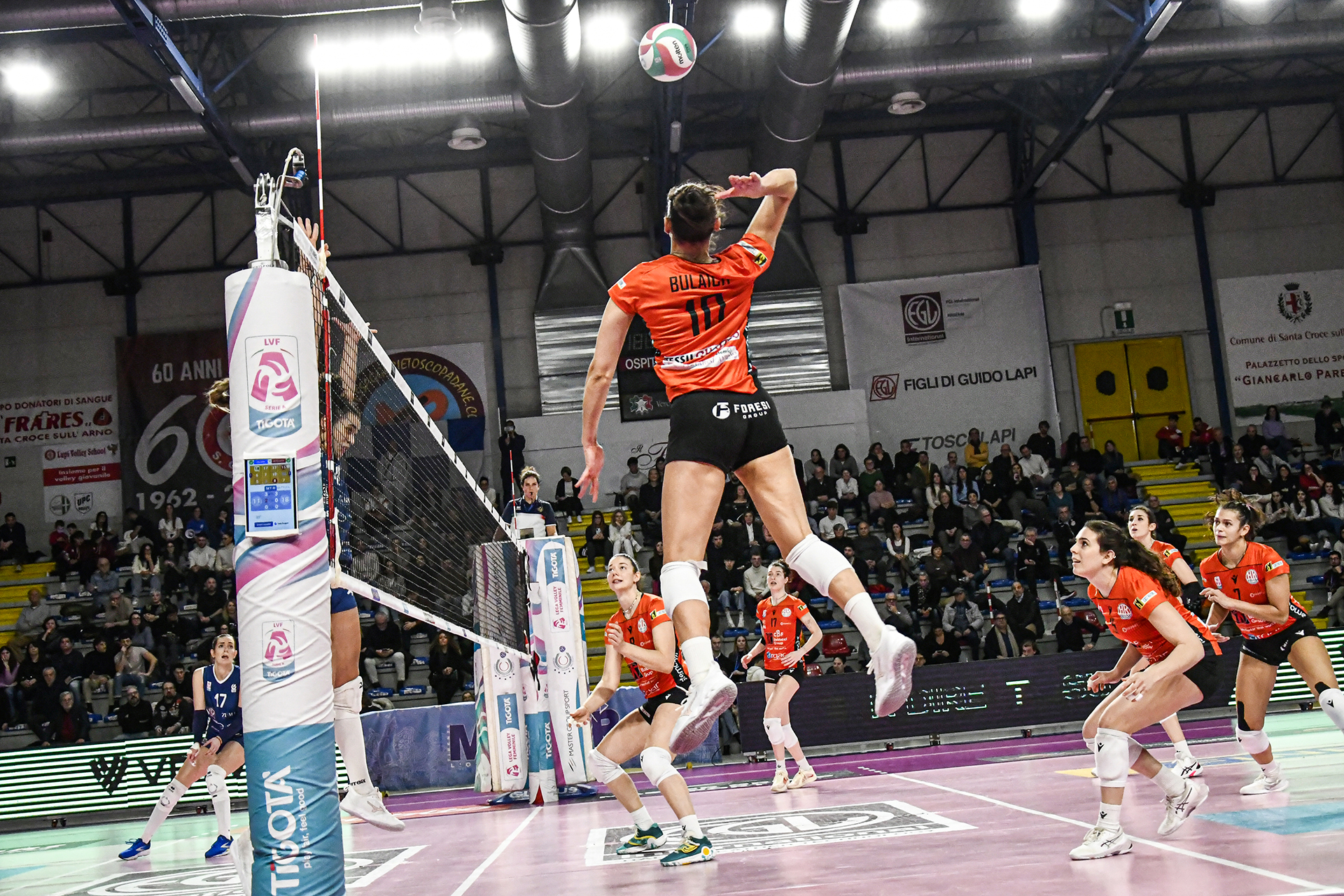 Le toscane provano a ripartire nel secondo set (3-1), le arancionere agganciano (4-4) e sorpassano sull’invasione di Fava (6-7), Bulaich contrattacca ed è 6-8. Battista va a segno (8-10), Caruso in fast (9-11) e Bulaich in pipe (9-12), arriva anche il muro di Battista per il 9-13. Ferraro tocca la rete (9-14), Caruso va in primo tempo (10-15), Salinas sbaglia (10-16) poi piazza l’ace del 12-16 ma Decortes risponde (12-17). C’è Fiesoli per Battista, Lotti non trova le mani del muro (13-19), l’arbitro giudica a terra una palla difesa da Bulaich (15-19) ma c’è ancora un errore di Lotti (15-21), anche Fava non trova il campo (15-22). Decortes contrattacca due volte (15-23 e 15-24), chiude Fiesoli 16-25.