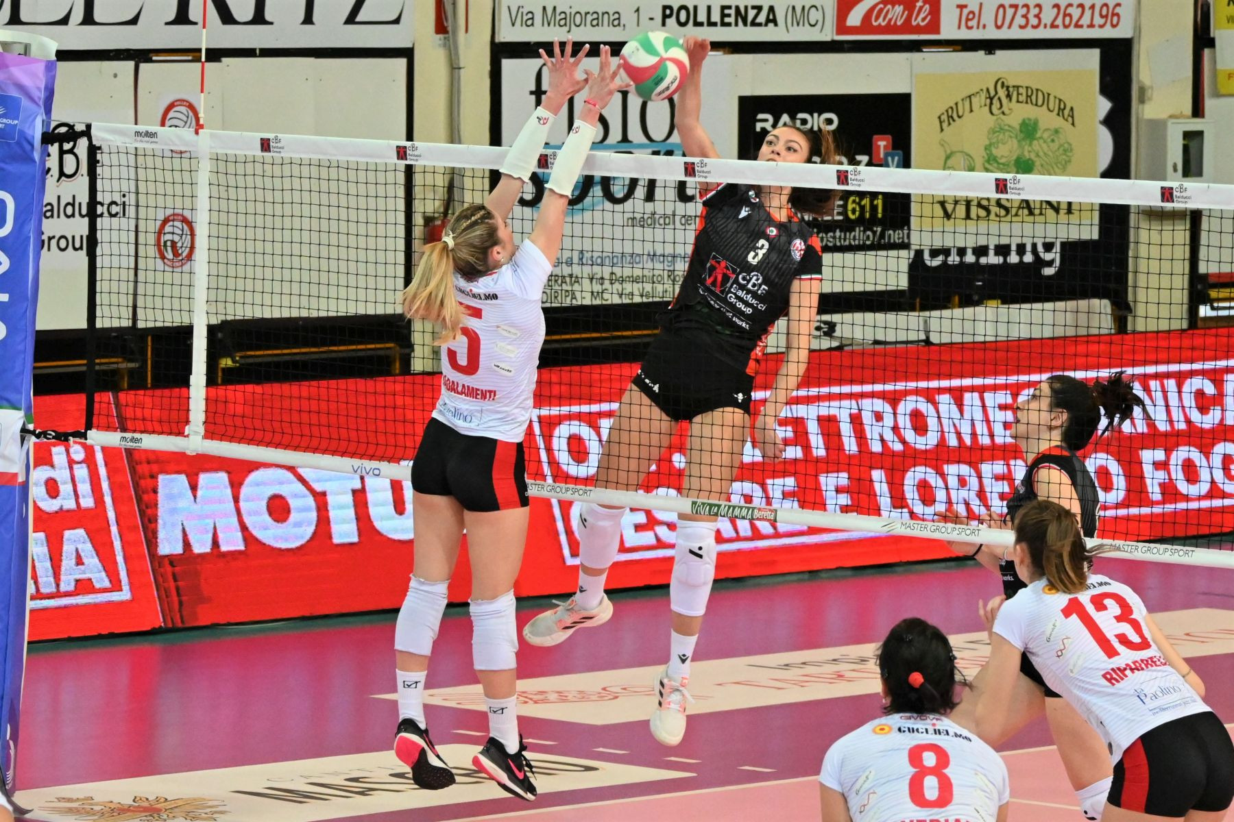 Soverato prova la reazione con con i muri di Buffo e Riparbelli e gli attacchi di Quarchioni ma la CBF Balducci è lesta a rimettersi in carreggiata. La Ranieri International prova ad allungare in più occasioni ma l’ottima Bresciani (MVP) guida da par suo la difesa di casa. Tra sorpassi e controsorpassi Tajè trova l’ace che riporta avanti Soverato (21-22), ma i due punti successivi prendono la via di Macerata con il punto di Pizzolato e l’errore in fast di Riparbelli. Fiesoli trova il match ball e Stroppa chiude gara 1 con il 25-23.