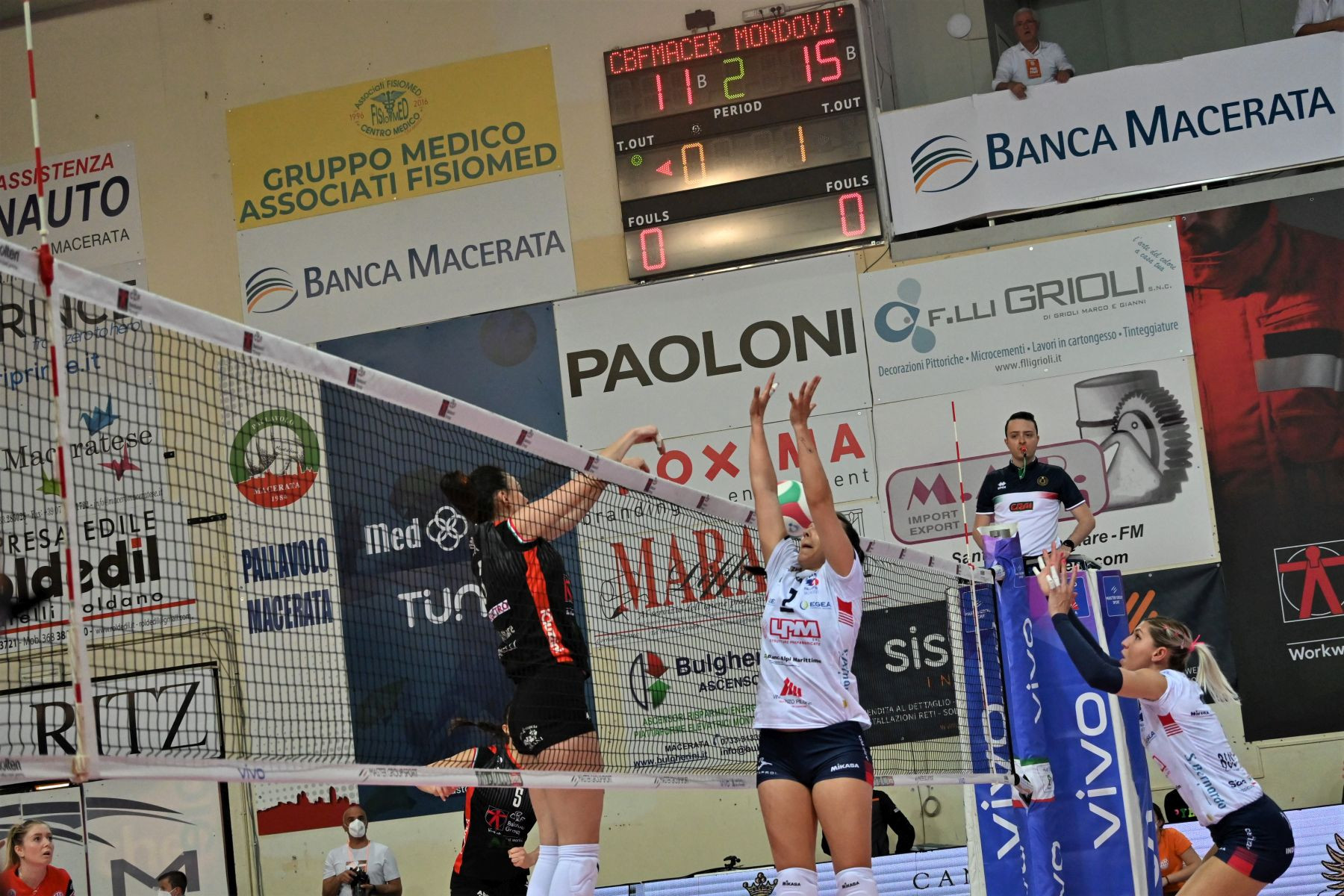 L’aggressività delle ospiti mette in crisi le certezze delle ragazze di Paniconi ma il secondo set è uno specchio fedele della partita. Taborelli, Hardeman e Trevisan sono scatenate al servizio ed in attacco, portando Mondovì sul 6-13. Piano piano però la CBF Balducci inizia a recuperare, anche perché in seconda linea Bresciani e compagne tengono bene. Pizzolato in primo tempo suona la sveglia, Fiesoli e Malik a seguire e quando Cosi sfrutta due ricezioni consecutive lunghe di Hardeman il ritardo è dimezzato (12-15). Ancora Taborelli prova a scacciare i fantasmi della rimonta ma due errori consecutivi, in battuta di Trevisan ed in fast di Montanari, zavorrano i tentativi di fuga di Mondovì. 15-17 e il tecnico ospite Solforati chiama time-out. Si ritorna in campo e si gioca punto a punto fino a che Cumino non incappa nel fallo del 20-20. Taborelli va out dai tre metri ed è primo vantaggio di Macerata. Stavolta però il copione è diverso: Malik tiene viva la fiamma delle speranze di casa, due errori di Taborelli danno il primo set ball alla CBF Balducci. È sempre lei ad annullare il primo ma il secondo lo finalizza Michieletto, che frantuma il muro di Mondovì per il 25-22.
