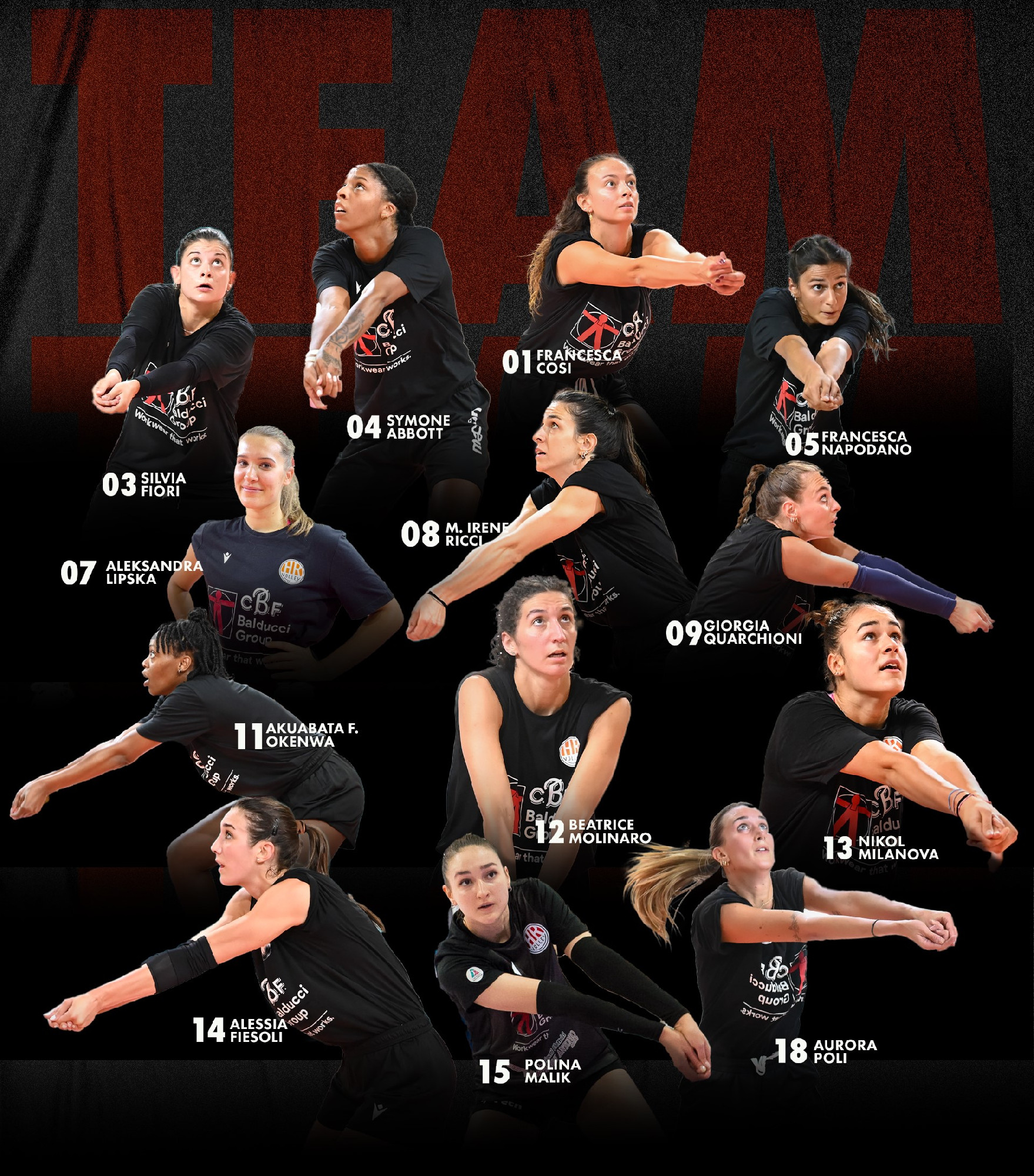 Si parte dalle quattro ragazze che facevano parte della rosa che ha conquistato la storica promozione in serie A1 femminile nello scorso campionato. Per la schiacciatrice Alessia Fiesoli resta saldamente sulle spalle il numero 14, mentre la centrale Francesca Cosi ha scelto per l’esordio nel massimo campionato il numero 1. Confermato il numero 15 per l’opposta israeliana Polina Malik, così come il numero 8 per la palleggiatrice Maria Irene Ricci.
