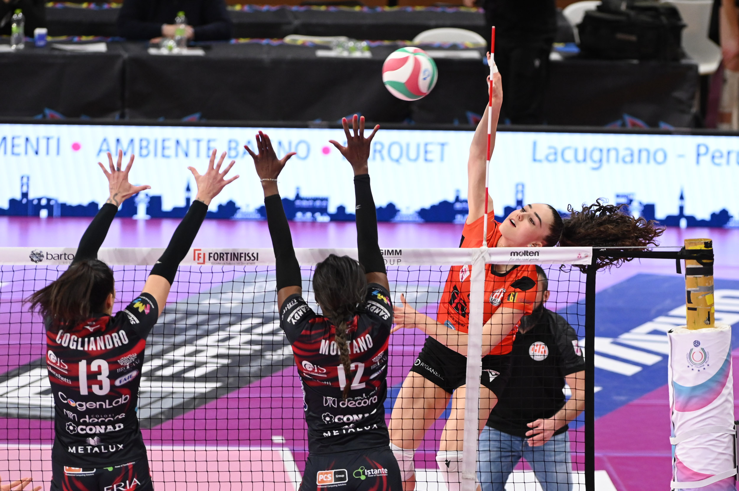 La CBF Balducci HR parte sotto 3-0 nel terzo set, poi con Mazzon risale subito sul 4-4 e sul 7-7 con un suo ace. Vittorini piazza il +1 arancionere (8-9), Traballi firma il nuovo sorpasso (12-11), coach Carancini prova Bolzonetti opposta per Stroppa. Montano e ancora Traballi pungono in contrattacco (15-12), poi le arancionere provano a reagire con Mazzon a filo rete (16-16): Perugia scappa ancora sul 19-17 con Kosareva ma viene ripresa dal muro di Bolzonetti su Traballi (21-21). Fiesoli riporta Macerata al +1 (22-23 con un gran contrattacco), Cogliandro la ferma (23-23), Mazzon guadagna il set ball (23-24) ma Kosareva annulla (24-24). Alla seconda occasione chiude Vittorini 24-26.