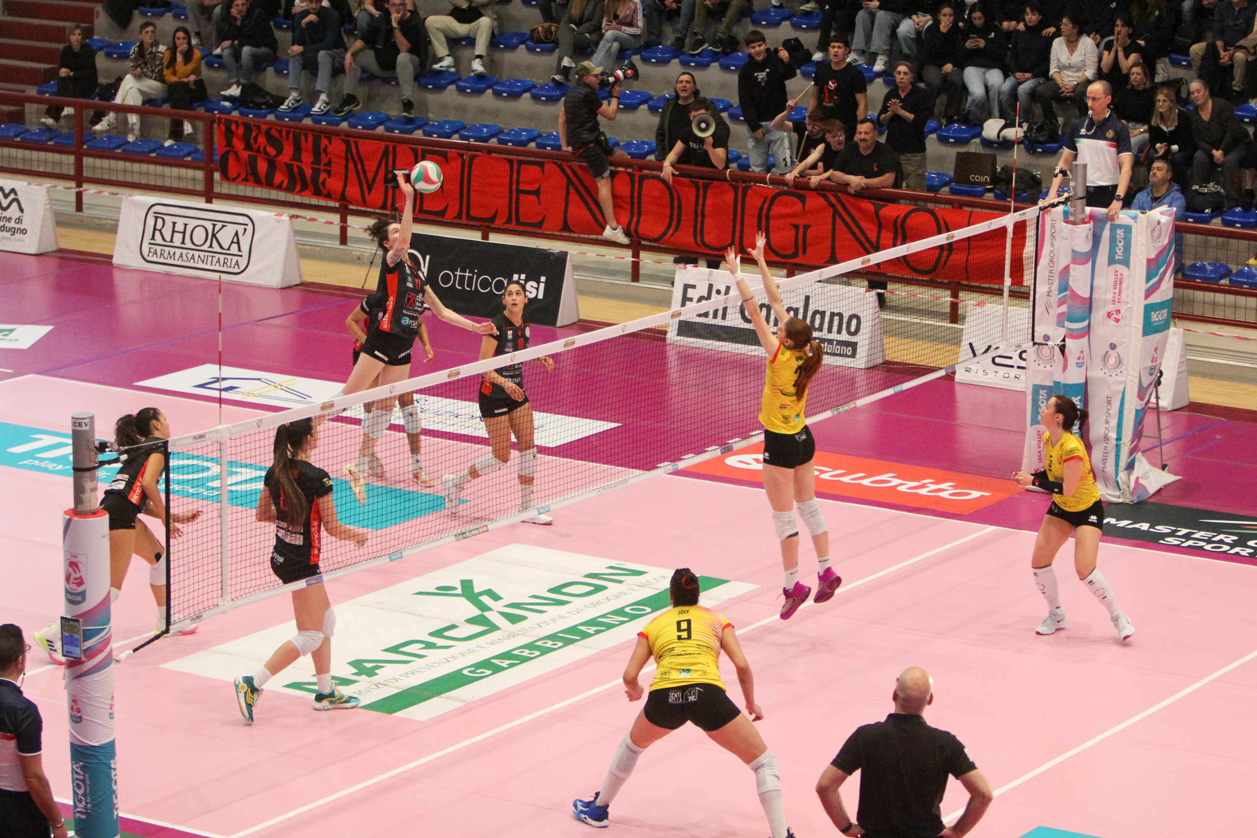 Nel secondo set la Narconon parte meglio (5-1) approfittando di un calo arancionero, Decortes e Battista rispondono (5-3), arriva l’ace di Mazzon (6-5) e ancora Decortes guadagna il 6-6 in contrattacco. Melendugno si rilancia col muro di Biesso (9-7) ma c’è il fallo in palleggio di Caracuta (10-10), Decortes va ancora (10-11), Bulaich anche (12-13), l’opposta arancionera firma il 12-14. Tanase ferma Mazzon (14-14), Battista va a segno (14-15). Arriva il contrattacco di Decortes (15-17) seguito da quello di Battista (15-18), Melendugno non molla con Mali (18-19), Caruso va in primo tempo (18-20), Allaoui entra al servizio e firma l’ace (18-21), Decortes la imita dai nove metri due volte di fila (19-24), Riparbelli ferma Bulaich (21-24), chiude Mazzon (21-25).