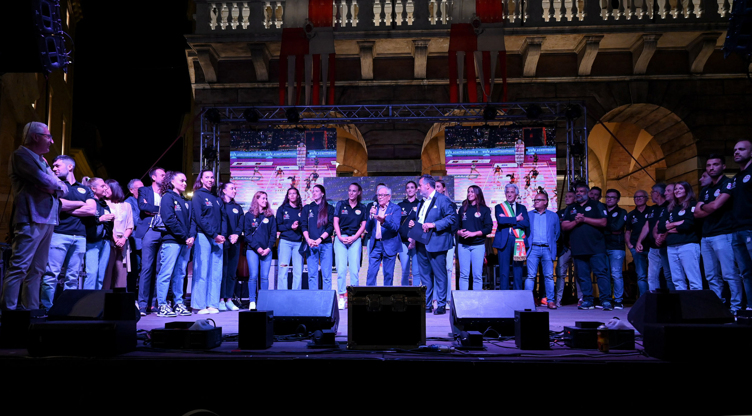 Vero e proprio bagno di folla per la CBF Balducci HR e una prima bella occasione per un iniziale contatto tra squadra e città. Nella serata di ieri, in occasione della festa di San Giuliano a Macerata, Fiesoli e compagne sono salite sul palco allestito in Piazza della Libertà per il vernissage organizzato dall’amministrazione comunale per presentare le maggiori realtà sportive cittadini, tra cui la formazione arancionera pronta ad affrontare il quinto campionato consecutivo in Serie A. Dopo la prima storica stagione in A1 conclusa lo scorso aprile, la CBF Balducci HR ripartirà di nuovo dalla Serie A2 con obiettivi ambiziosi e idee chiare.