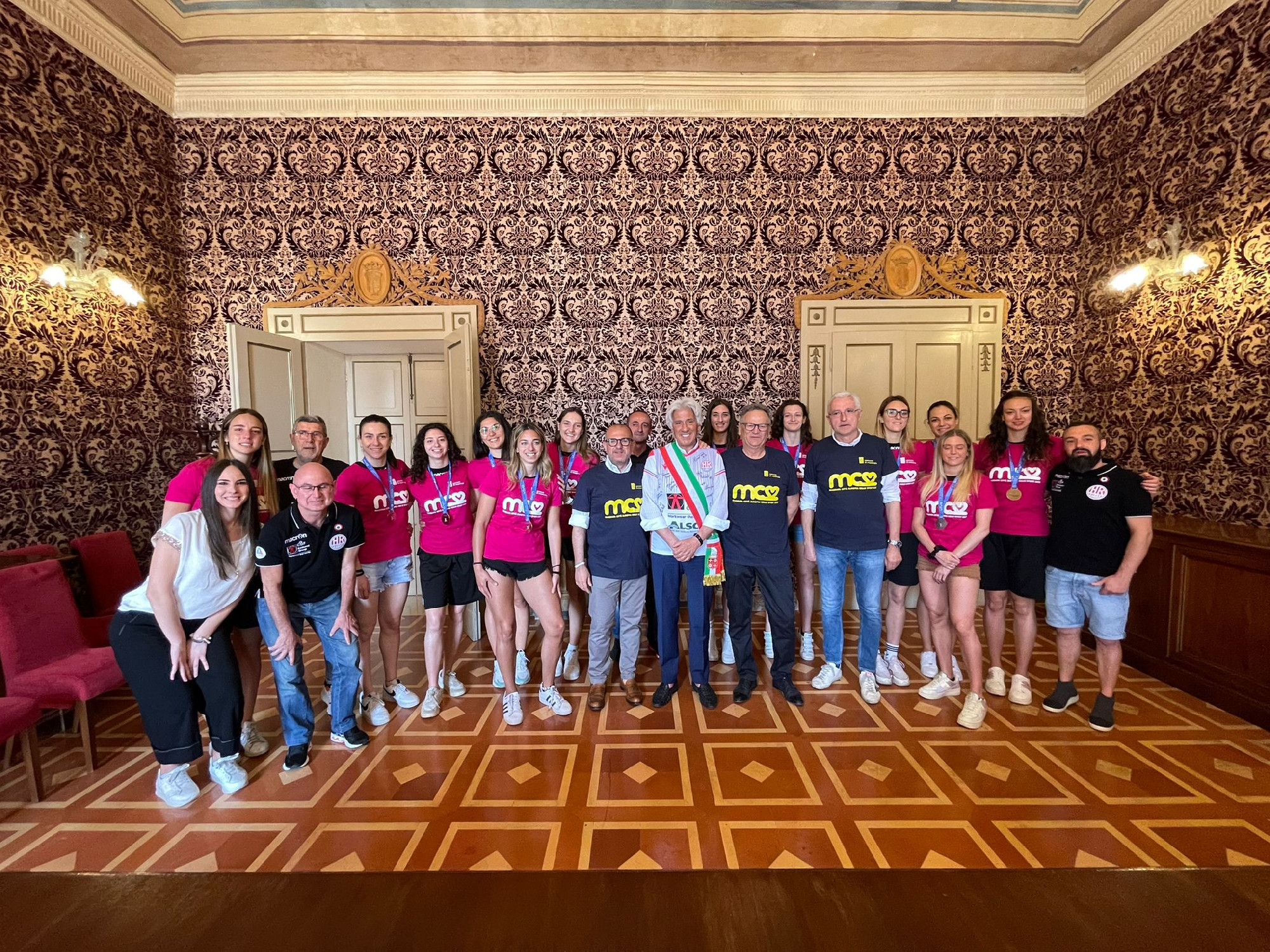 Il sindaco Sandro Parcaroli e l’assessore allo Sport Riccardo Sacchi hanno ricevuto questa mattina, in sala consiliare, le atlete della CBF Balducci HR Macerata che sabato sono state promosse in vivo Serie A1 di volley femminile dopo aver vinto 3-2 contro Mondovì in gara 3 di finale playoff. Alla compagine vincitrice del titolo nazionale è stato consegnato il premio Macerata Più, il riconoscimento simbolico che l’Amministrazione ha istituto per sottolineare il valore dello sport e premiare le eccellenze sportive sia sotto il profilo dei risultati che dell’etica.