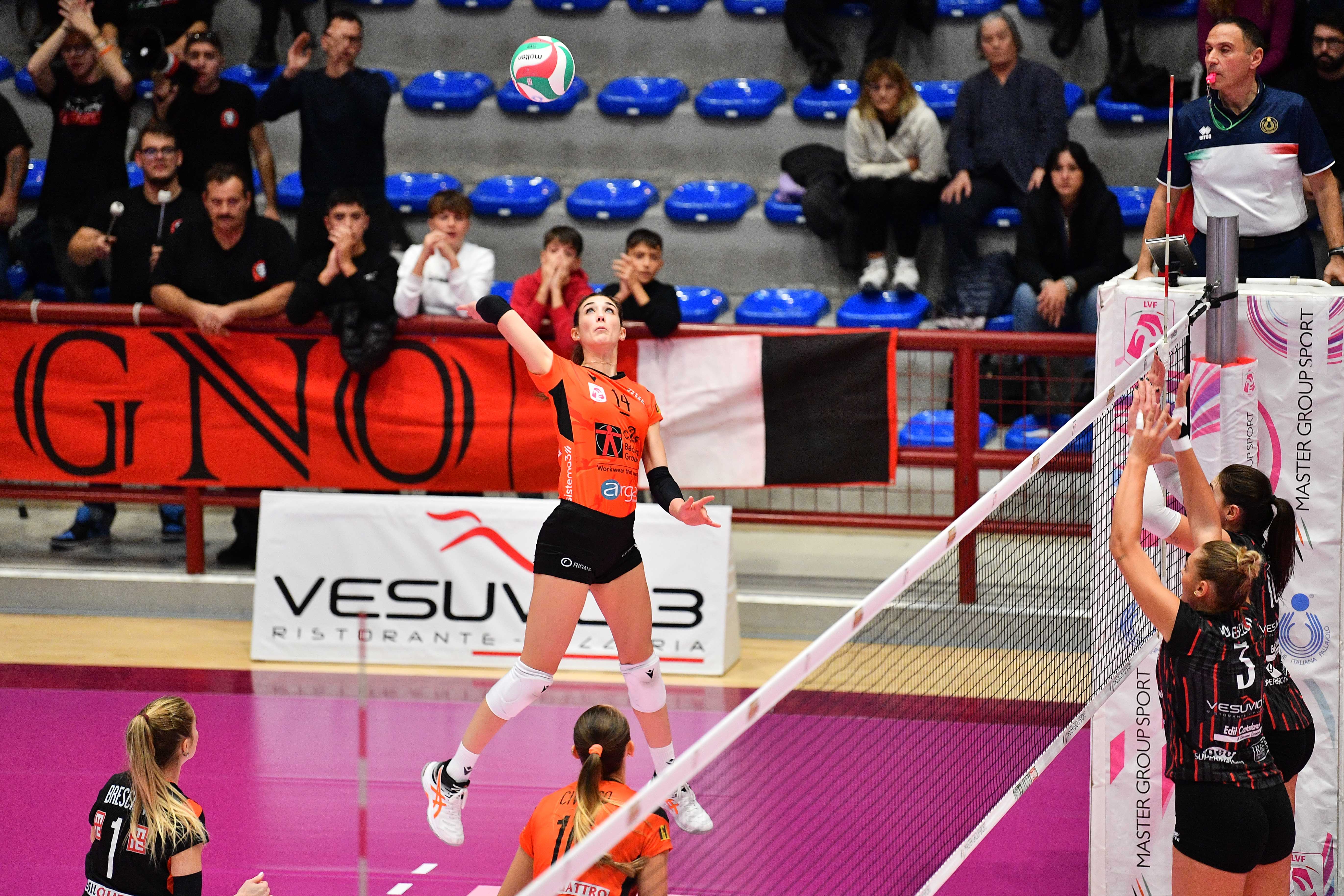 Nel secondo set il primo break è di Bolzonetti (4-6), un +2 che le arancionere tengono e allungano ulteriormente con il muro di Korhonen (8-11) e con il contrattacco di Fiesoli (8-13). Napolitano inserisce Campana per Santiago ma il servizio della CBF Balducci HR continua a pungere con Mazzon, Civitico ne approfitta mettendo a terra il 12-18. Korhonen non trova la riga e le salentine risalgono sul 16-19 col servizio insidioso della neo entrata Campana e ancora sul 18-20 con Maruotti. C’è l’esordio in campionato per Morandini in ricezione per Bolzonetti, Fiesoli mura Rastelli (18-22) e l’arbitro chiama out il colpo di Mazzon (20-22). Bolzonetti non passa (23-24) poi Korhonen chiude in pipe 23-25.