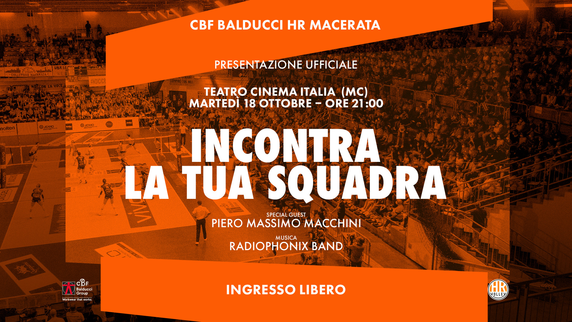 INCONTRA LA TUA SQUADRA! La CBF Balducci HR Macerata si presenta alla città con uno spettacolo aperto a tutti coloro che vorranno partecipare (ingresso libero fino ad esaurimento posti). Martedì 18 ottobre alle ore 21.00, presso il Teatro Cinema Italia di Macerata, andrà in scena una serata di intrattenimento e musica in cui sarà possibile conoscere da vicino le ragazze arancio-nere e lo staff a pochi giorni dal via della prima storica stagione in Serie A1 femminile.