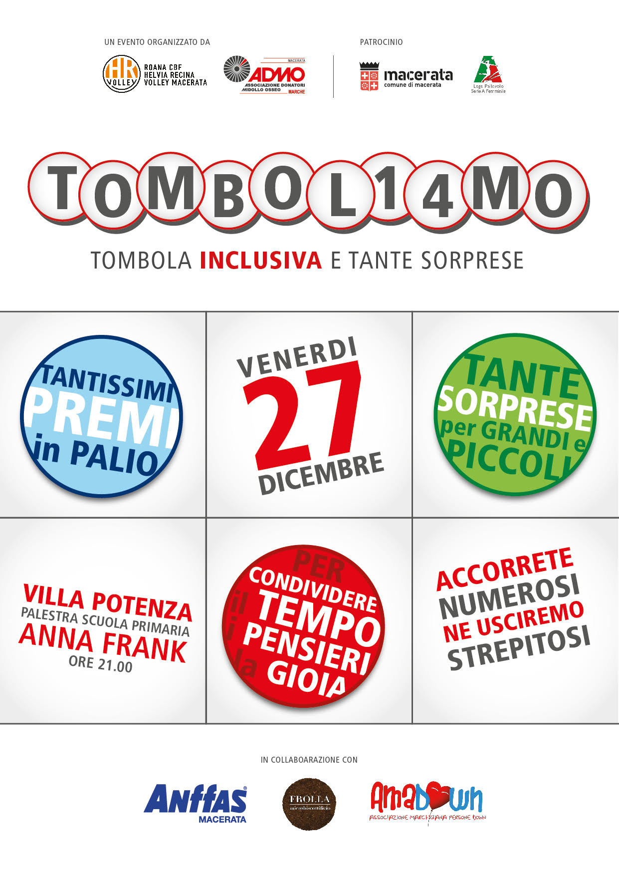 Dopo il successo dello scorso anno, il prossimo 27 dicembre dalle ore 21 alla palestra della scuola primaria Anna Frank si terrà la seconda edizione di Tomboliamo, la tombolata inclusiva organizzata da Helvia Recina Volley Macerata e Associazione Donatori Midollo Osseo Macerata, a cui sarà devoluto l’incasso dell’evento. Cambia dunque la sede rispetto alla prima edizione, che si svolse al centro fiere di Villa Potenza.