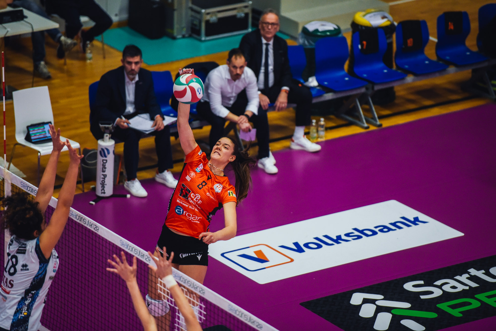 Nel terzo set in campo Zojzi per Giuliani e Allaoui per Bonelli, resta anche Fiesoli per Bulaich. Trento viaggia sulle ali dell’entusiasmo fino al 6-3, Fiesoli passa (7-5), Kosareva sbaglia (7-6), Marconato ferma Battista (9-6), Mazzon risponde su Kosareva (9-7). Battista non passa (11-7), al suo posto entra Bulaich, Caruso non trova la riga (12-7), entra Busolini per lei. Decortes va a segno due volte (12-9), Bulaich contrattacca (12-10), Zojzi sbaglia due colpi (13-12), Decortes la mura tenendo lì le arancionere (14-13). Decortes contrattacca (14-14), Fiesoli pure (14-15), entrano Bassi per Weske e Batte per Prandi, ma sbaglia subito (14-16), poi va a segno (15-16). Mazzon contrattacca (15-18), c’è l’ace di Decortes (15-19), Mazzon mura Bassi (16-21), anche Bulaich la ferma (16-23). Kosareva contrattacca tenendo viva Trento (19-23), Prandi trova l’ace con il nastro (20-23), Bulaich va a segno (20-24), Decortes chiude 21-25.