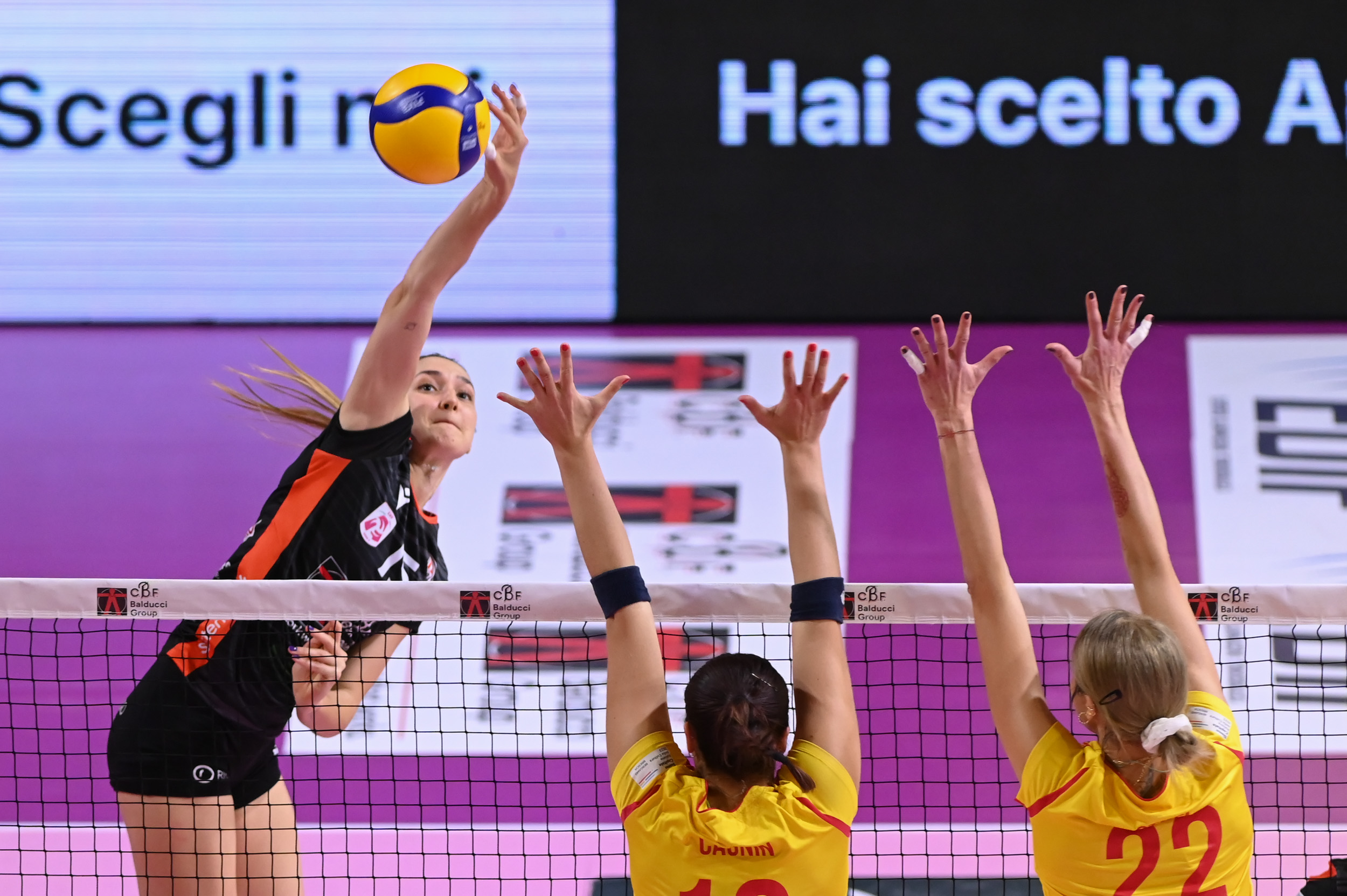 Coach Paniconi (Lipska out) parte ancora con Ricci in palleggio, Malik opposta, al centro Cosi-Molinaro, Abbott-Fiesoli in banda, Fiori libero. Napodano è in panchina come schiacciatrice, in rosa anche le giovanissime Luciani e Piccotti. Per coach Micoli all’inizio in campo Gennari-Lorrayna, Stufi-Butigan, May-Cagnin, Cecchetto libero.
