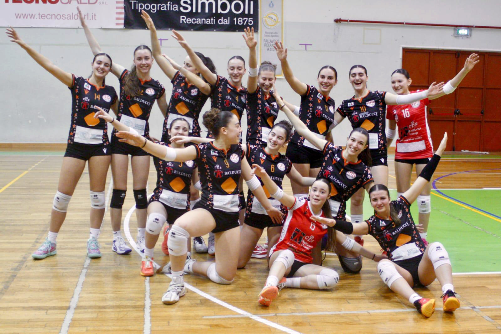 Un nuovo successo per il settore giovanile arancionero: la Under 16 targata CBF Balducci Paoloni Macerata (in collaborazione con la Volley School, formata insieme alle società Paoloni Appignano e Volley Macerata) ha infatti conquistato ieri il titolo di campione provinciale nella fase finale di categoria, disputata nella giornata di domenica 24 marzo negli impianti di Montecassiano (in semifinale) e Recanati (nella finalissima). La formazione guidata da coach Nicola Bacaloni, direttore tecnico del settore giovanile, e dalla vice coach Arianna Pagnanini, ha nettamente vinto le due sfide: 3-0 nella semifinale che le vedeva di fronte a Il Ponte Morrovalle (25-9, 25-17, 25-17 i parziali) e poi altro 3-0 nell’atto conclusivo contro le pari età della Paoloni Appignano (25-20, 25-15, 25-9).