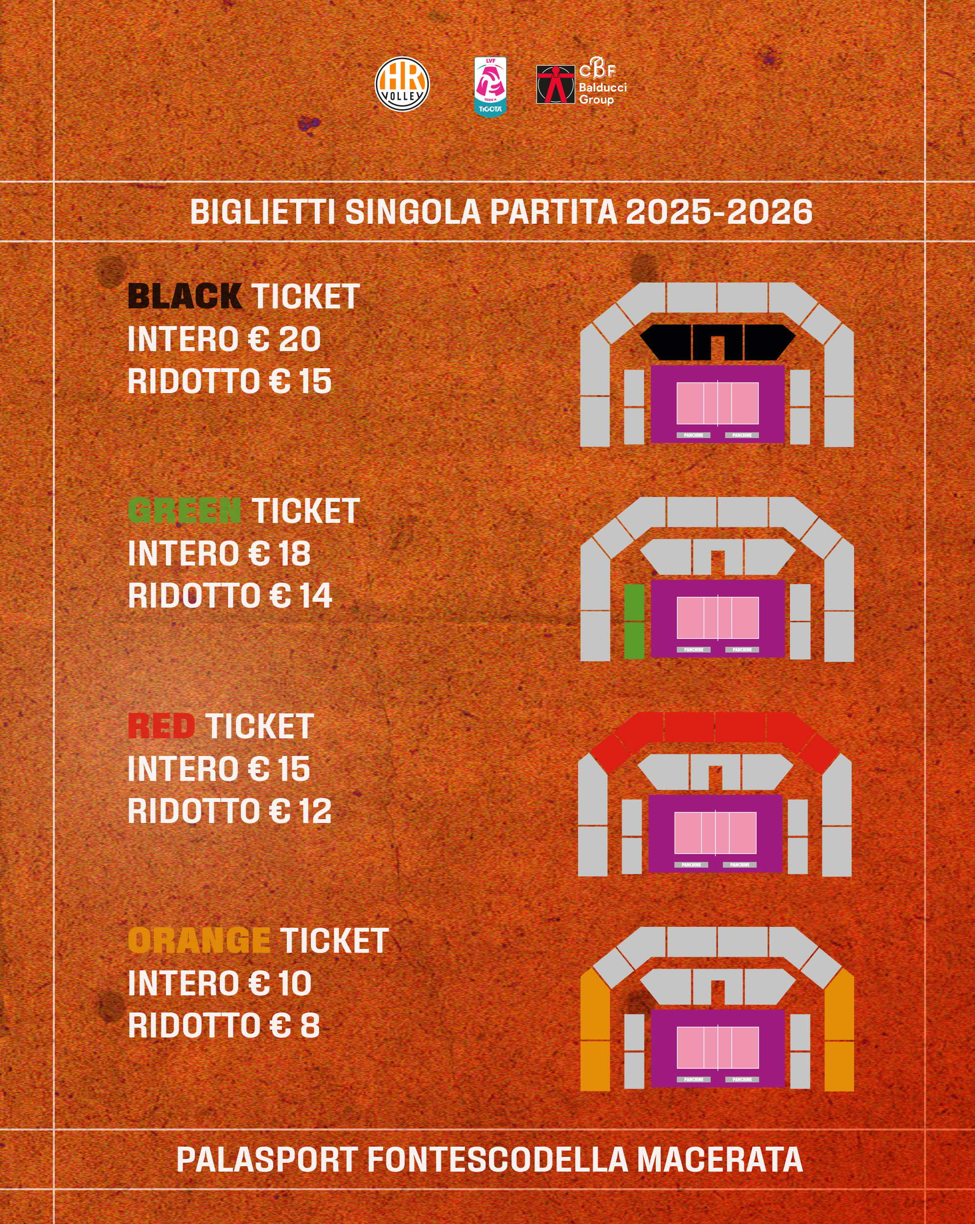 - RED (settori Gradinata centrale, Gradinata laterale nord/sud): Biglietto intero 15 Euro, ridotto* 12 Euro